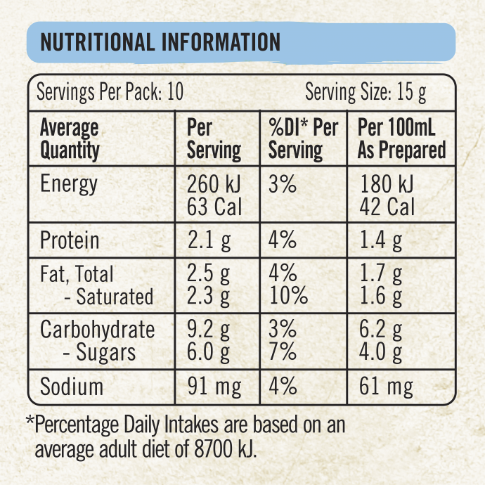 Bột đường: Chất rắn trong sữa, Dầu thực vật, Cà phê hòa tan (13%), Xi-rô glucoza, Đường, Hương liệu, Chất ổn định (340, 452, 331)