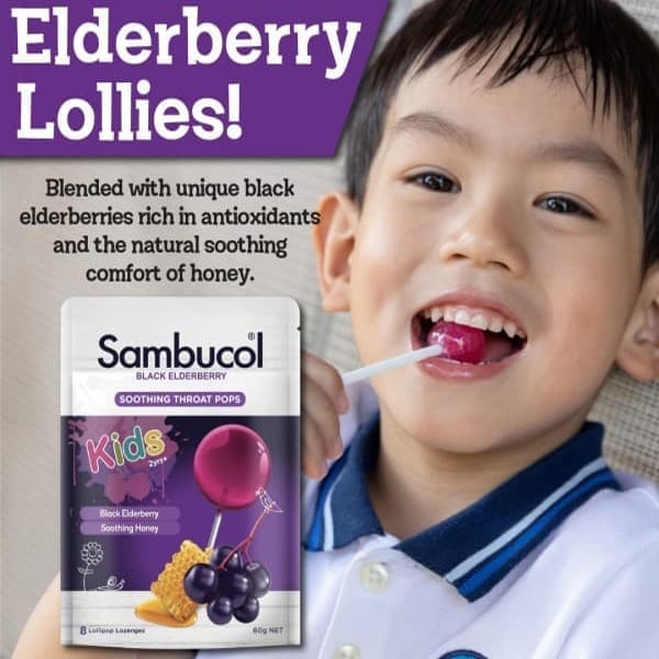 Kẹo mút giảm đau họng cho bé Sambucol Kids Soothing Throat Pops chứa quả cơm cháy đen thơm ngon độc đáo, giàu chất chống oxy hóa và bùng nổ với hương vị mà con bạn sẽ yêu thích.
