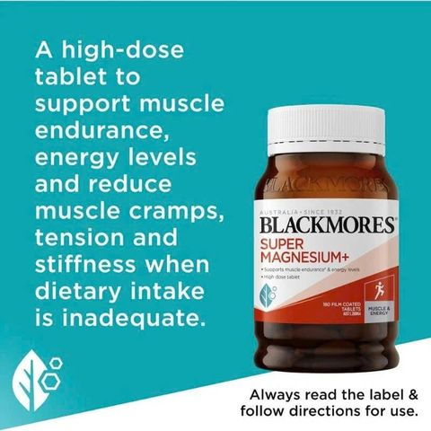 BLACKMORES Super Magnesium+ cung cấp viên nén liều cao, uống một lần mỗi ngày với các dạng magie dễ hấp thụ cùng crom và mangan để hỗ trợ năng lượng và giảm chuột rút cơ khi chế độ ăn uống không đầy đủ. Viên nén này cũng giúp hỗ trợ cân bằng điện giải, sức khỏe hệ thần kinh và sức bền cơ bắp khi chế độ ăn uống không đầy đủ. Uống hàng ngày cùng với bữa ăn, sản phẩm phù hợp hoàn hảo với thói quen chăm sóc sức khỏe của bạn - bởi vì sức khỏe tốt sẽ thay đổi tất cả.