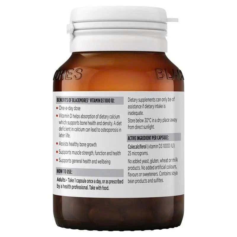Sức khỏe tốt thay đổi mọi thứ - hãy hỗ trợ sức khỏe hàng ngày của bạn với Blackmores Vitamin D3 1000 IU. Vitamin D đóng vai trò quan trọng đối với sức khỏe của bạn, đặc biệt là trong việc hỗ trợ sự toàn vẹn của xương, chức năng cơ bắp và sức khỏe hệ miễn dịch. Công thức này cung cấp 1000 IU vitamin D3, một dạng giúp cơ thể hấp thụ canxi, rất cần thiết để duy trì khối lượng xương và hỗ trợ sự phát triển xương khỏe mạnh. Điều này đặc biệt quan trọng khi chúng ta già đi, hoặc nếu bạn ít tiếp xúc với ánh nắng mặt trời. Blackmores Vitamin D3 cũng giúp hỗ trợ chức năng cơ bắp và duy trì chức năng hệ miễn dịch, làm cho nó trở thành một sự bổ sung có giá trị cho thói quen chăm sóc bản thân của bạn - đặc biệt là trong những tháng lạnh hơn. Nó cũng giúp duy trì mức vitamin D trong cơ thể cho những người có nguy cơ thiếu vitamin D. Sản phẩm cũng được chứng nhận Halal, phù hợp với nhiều sở thích và nhu cầu ăn kiêng khác nhau. Uống hàng ngày cùng với thức ăn để hỗ trợ sức khỏe của bạn một cách tự tin.